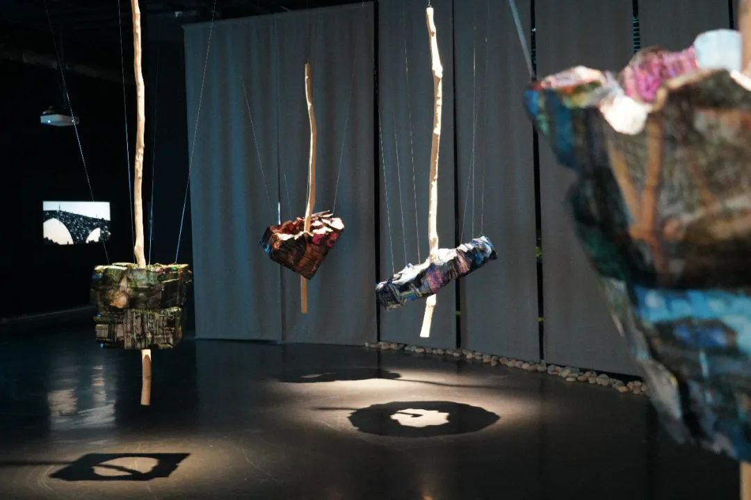 同时,展览还提供了一个可观、可坐、可游、有趣的身临其境的影像艺术场景。观众站在胡介鸣的三屏互动影像《水下》之前,影像内容会根据观众距离而变化。观众可以坐在展览空间周围的蒲团或大大小小的鹅卵石沙发上,沉浸在视觉与身体交织的视觉体验中。展览厅内围绕作品进行风格化搭景,并在出口处专门定制主题印章,吸引观众在观看时拍照打卡。