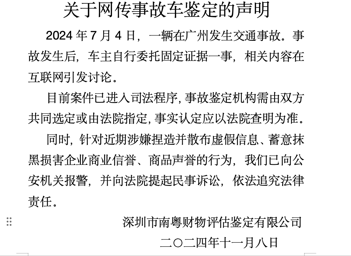 与此同时,南粤鉴定公司解释了车主的委托:2024年7月4日,广州发生了一起交通事故。事故发生后,车主委托固定证据,相关内容在互联网上引起讨论。目前案件已经进入法律程序,事故鉴定机构应当由双方共同选择或者由法院指定,事实认定应当以法院查明为准。
