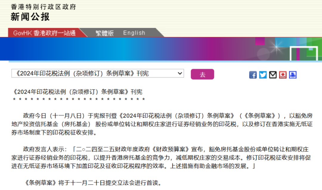 8日,香港特区政府于宪报刊登《2024年印花税法律(杂项修订)条例草案》,免除房地产投资信托基金股份或单位转让和期权经销商证券经销业务印花税,并在香港实施无纸证券市场制度下修订印花税征收安排。