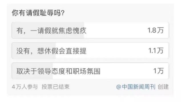 中国新闻周刊曾经做过一个调查。通过调查,可以看出近4万人参与投票,其中45%的人选择了“是的,他们一度假就焦虑内疚”。
