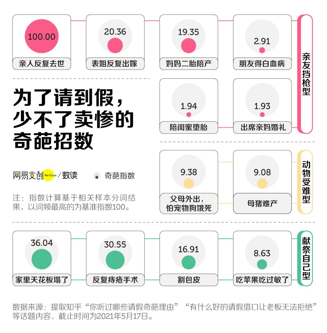 每个可耻的农民工都尽力找到合适的请假理由。网易数读曾经做过一个“请假理由”,让你大开眼界,受益匪浅。