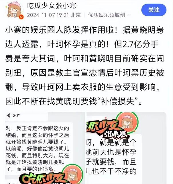 著名狗仔张小寒说,他在娱乐圈有一些人脉。知情人说叶珂怀孕了,他们之间的矛盾是真的。因为叶珂的网店生意受到之前直播内容的严重影响,他开始向黄晓明要求赔偿。