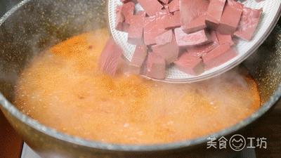 4. 加入鸭血和豆泡,再煮一次,继续用小火煮。 3 加入粉丝几分钟。
