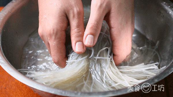 5. 将粉丝煮熟后,放入蔬菜中,用酱油、盐、醋和白胡椒调味。