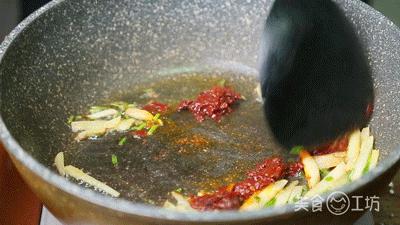 3. 锅内滚油,爆香姜蒜,豆瓣酱,倒入清水和浓汤宝,盖上煮沸。