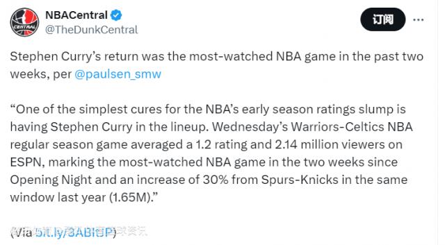 这位媒体写道:“治疗 NBA 最简单的方法之一就是让斯蒂芬在赛季初收视率低下。 - 库里出场。勇士和凯尔特人星期三在一起。 NBA 常规赛在 ESPN 平均收视率为 观众人数为1.2 214 万,这是自揭幕战以来两周内收视率最高的一场比赛。 NBA 与去年同期的马刺和尼克斯相比,这场比赛(165 万)增强了 30%。"库里在勇士 118-112 击败凯尔特人队的比赛被砍掉了。 27 分 7 篮板 9 助攻 4 断球 1 盖帽。