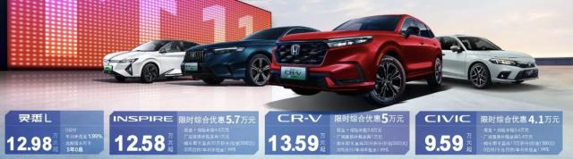 今天,东风本田正式出台了限时购车政策,即日起至 11 月 30 日,购买灵悉 L、英仕派、CR-V、思域车型可以享受限时优惠政策。在海报上,东风本田为所有车型标注了优惠后的起步价格,其中思域只需要 9.59 万元起,CR-V 则是 13.59 万元起。