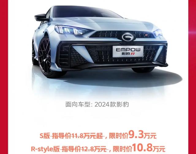 最近,广汽传祺宣布 11 每月最新买车权益,其在售车型基本都有涉及。这些都是其中之一。 2024 款影豹 S 版限时价 9.3 万元,R-style 版限时价 10.8 万元,影豹混合动力享受限时无上补贴。 2 一万元,补贴后只需 10.8 万元起。如果有旧车报废,还可以享受我国“新旧置换”补贴。 1.5 万元。