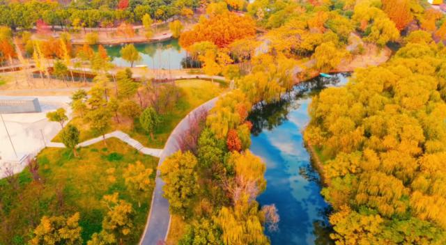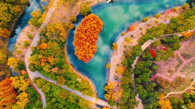 秋天的罗泾水源涵养林就像一片五彩缤纷的童话森林。在蓝天下,层层叠叠的树木被红色、黄色和渐变的颜色所渲染。阳光透过树叶的缝隙散落,像一点点金光,映在波光粼粼的湖面上,风景优美。
