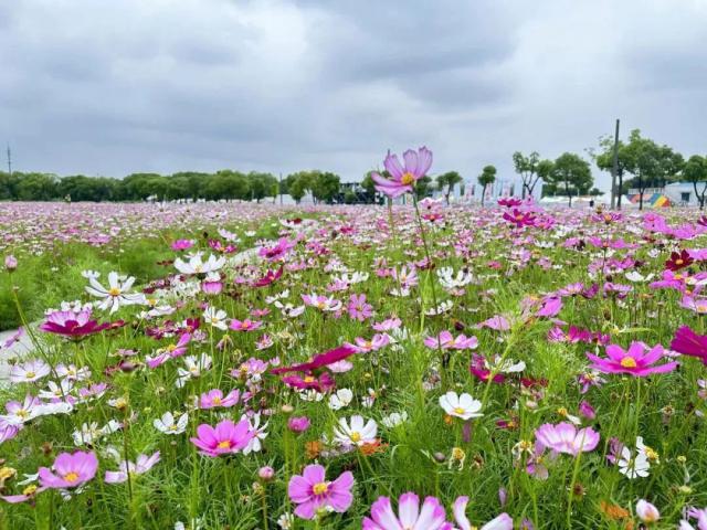 顾村镇沈杨村成片的波斯菊、矢车菊已经进入开花阶段。许多市民游客慕名而来, 2 在一万多平方米的花海里散步,打卡拍照。预计花期将持续到 11 月中旬。