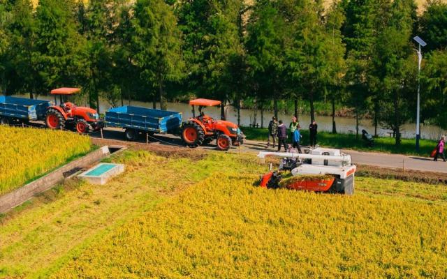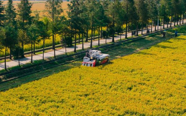 金色的稻田里,一台台收割机来回穿梭;农夫们忙于田间地头,脸上洋溢着丰收的喜悦。