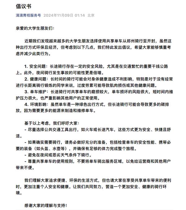 对这种行为,滴滴青桔连夜发布倡议,希望大家能深思熟虑,减少这种行为。