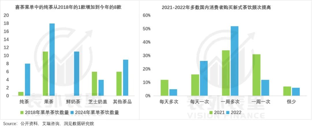 这还没有结束。未来,茶叶百道、古茶等二线茶叶以其性价比优势迅速发展,成交量迅速增加。迫于竞争压力,喜茶奈雪开始增加成本较低的纯茶供应。2018-2024年,喜茶菜单中的纯茶从1款增加到8款,新茶进入了“茶味大于奶味”的时代。
