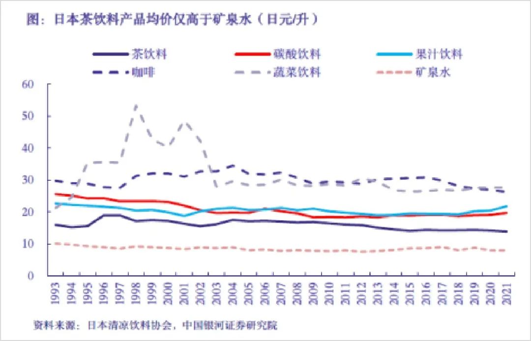 20世纪90年代,日本的无糖茶饮料每升价只有15日元,是可乐价格的60%。、65%的果汁,只比矿泉水贵一点。