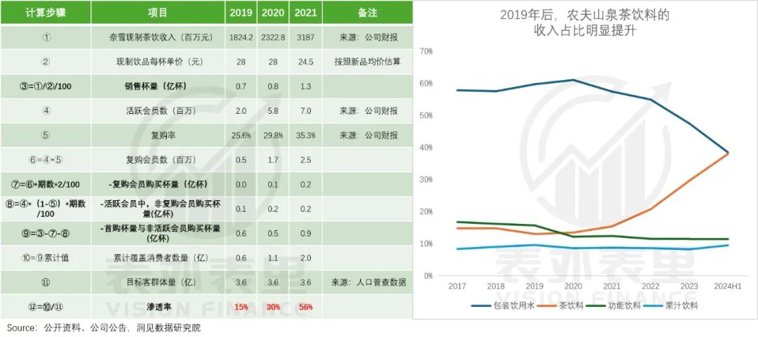 如下图所示,2019-2021年,奈雪茶在年轻人中的渗透率从19%上升到56%。;与此同时,茶饮料对农夫山泉的收入贡献也逐步增加。