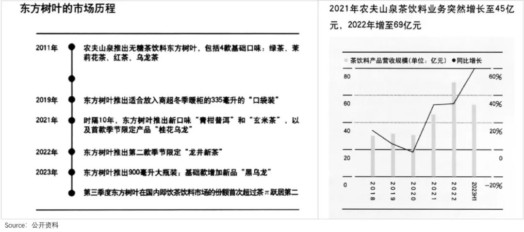 随后,2018年,被钉在“难喝”耻辱柱上的东方叶子开始口碑提升——农夫山泉创始人钟邈邈在采访中突然爆料,一直拖后腿的东方叶子“销量跃进,业绩扭亏为盈”。
