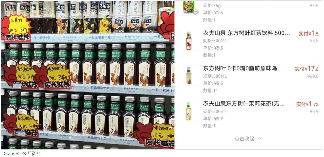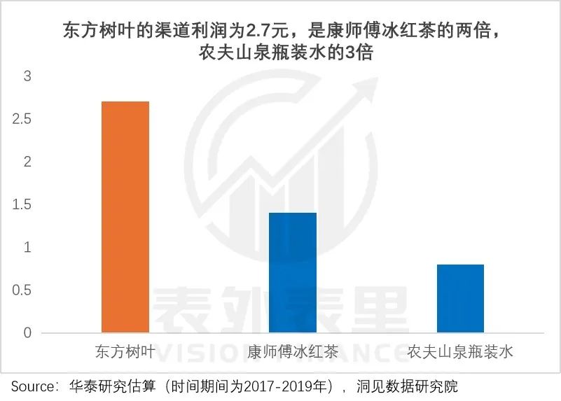 另外可以看出,东方树叶的盈利能力是2.7元,是康师傅冰红茶的两倍,是农夫山泉桶装水的三倍。在巨额资金下,渠道更有勇气以价换量。