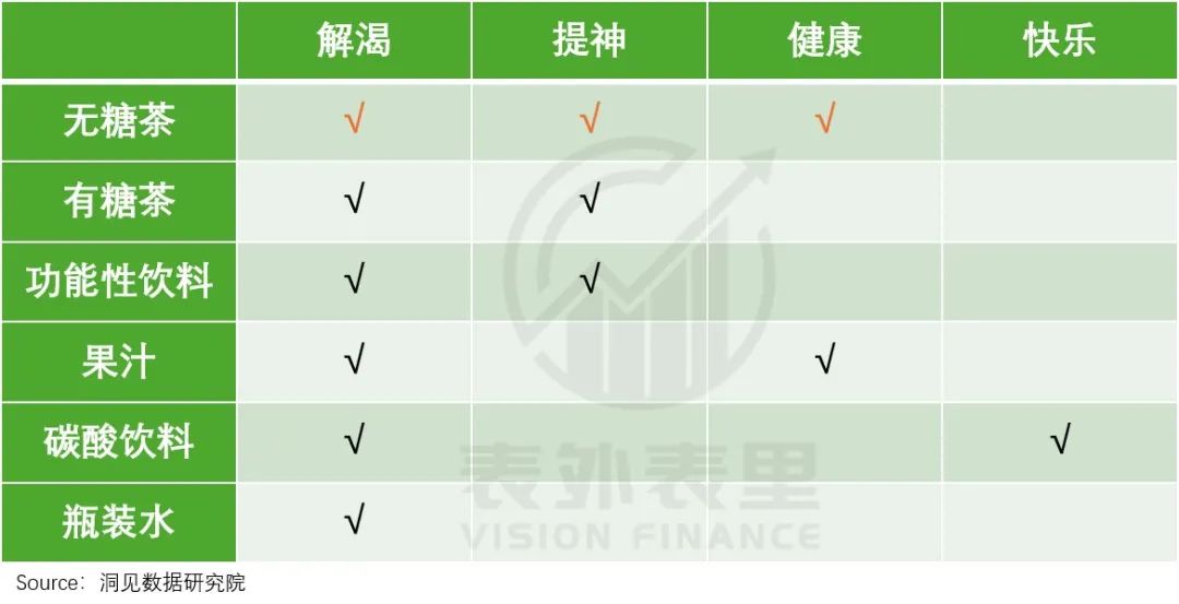 从这个角度可以看出,无糖茶的成分兼顾了解渴、提神、健康等功能,而糖茶、汽水等其他畅销饮料大多只能满足两个需求。