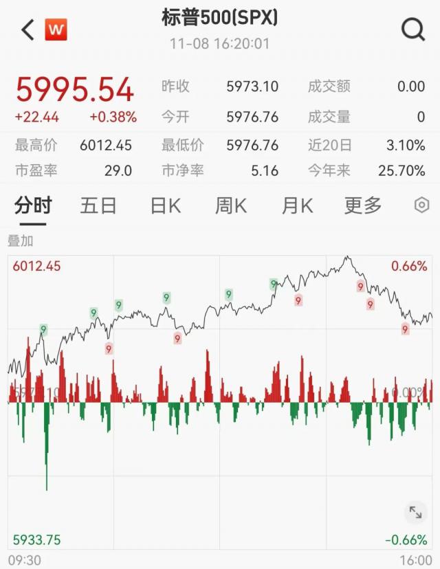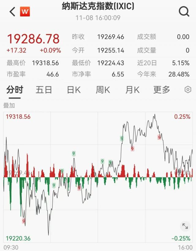 美东时间 11 月 8 日本,美国三大股指全线收涨。在收盘时,道指上涨 本周累计上涨0.59%。 4.61%;标普 500 指数涨 本周累计上涨0.38%。 4.66%;纳指涨 0.09%,本周累涨。 5.74%;都再创历史新高。道指、标普是其中之一 500 指数均创 2023 年 11 到目前为止,纳指创下了最大单周涨幅。 2 到目前为止,每周最大涨幅。