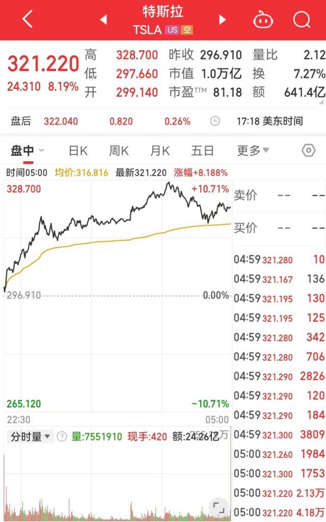 超过1亿美元的特斯拉市值!马斯克身家超过3000亿美元