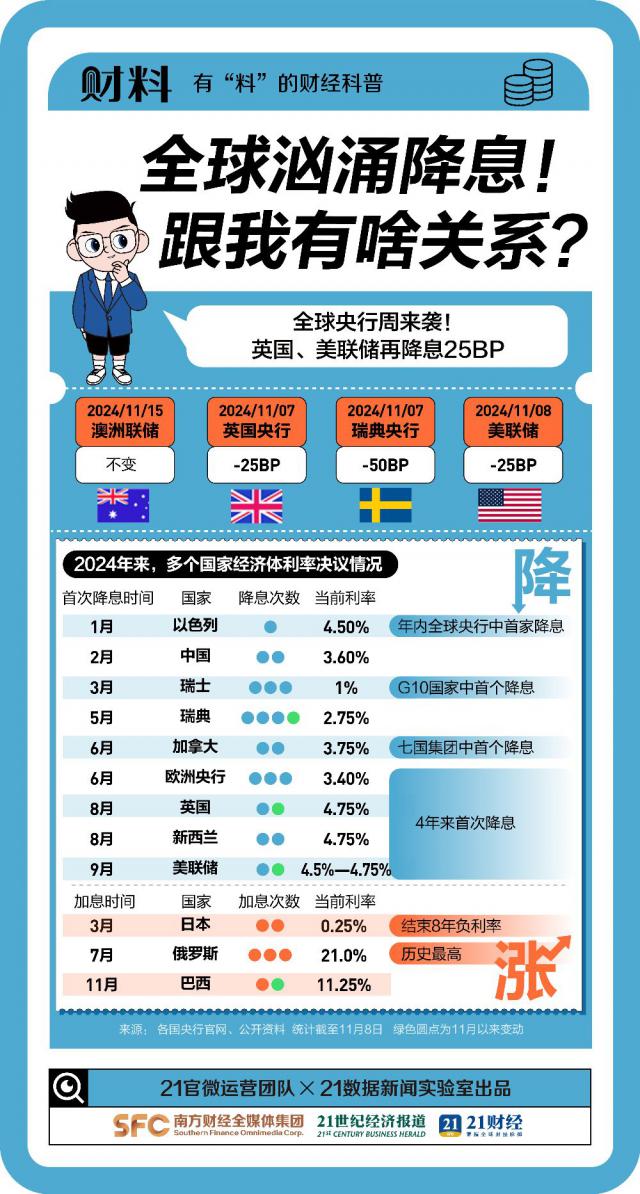 据 21 美联储数据新闻实验室统计 2024 多年来已降息 75 除了美联储,瑞典和英国央行也分别降息。 50BP、25BP,全球货币政策相继转变为宽松。