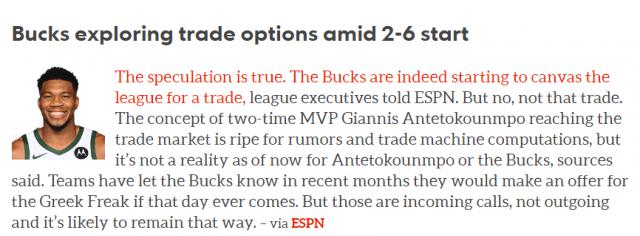 名记 Bontemps 费城的开局比密尔沃基差,恩比德和乔治因伤缺席了很多时间。现在班凯罗因伤缺阵,魔术也遭遇了一波连败。在新阵容的带领下,尼克斯开始缓慢。哈利伯顿和步行者的开局也不太好。热火队也是如此。对雄鹿来说,保持耐心是合理的。许多球探和高管告诉他们 ESPN,它们认为雄鹿不能完成任何能够带来本质变化的交易。