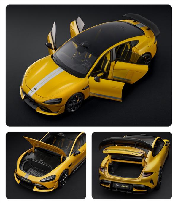 外表和小米完全一样 SU7 Ultra 量产车一致,模拟真车碳纤维质感后视镜,固定大尾翼,选择锻造轮毂款式,支持方向盘与车轮联动转换,四个车门都可以打开,运动座椅,黄色保险带,复制实车细节。