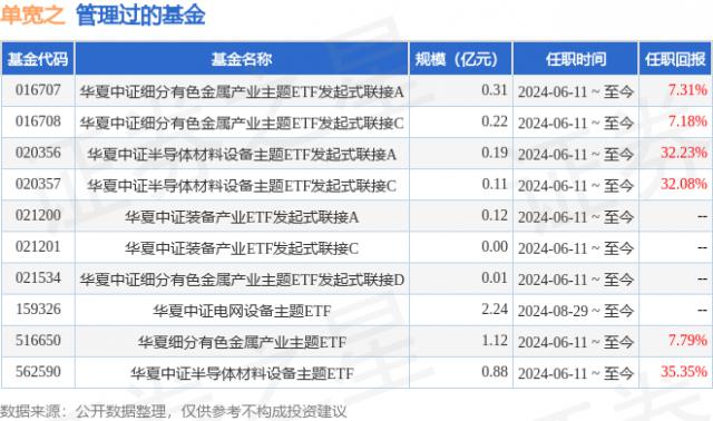 单宽先生:硕士。2016 年 4 月至 2019 年 1 月,曾任前海金融控股有限公司投资经理助理 ;2019 年 1 月至 2024 年 1 月份,曾任华宝基金管理有限公司基金经理助理。2024 年 2 每月加入华夏基金管理有限公司,曾担任数量投资部研究员。2024 年 6 月 11 日起担任华夏CSI半导体材料设备主题交易型开放式指数证券投资基金、华夏CSI半导体材料设备主题交易型开放式指数证券投资基金发起式连接基金、华夏CSI有色金属产业主题交易型开放式指数证券投资基金、华夏CSI装备产业交易型开放式指数证券投资基金发起式连接基金主管、华夏CSI有色金属产业主题交易型开放式指数证券投资基金发起式连接基金主管。