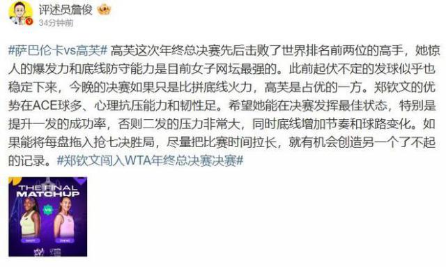 詹俊谈郑钦文:拉长比赛时间,就有可能创造另一个伟大的记录。