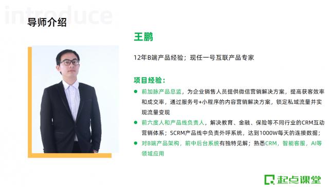 这个教学老师是为了目前,一号互联产品专家 @王鹏老师,教师深耕因特网 B 端领域 12 年,对 B 终端产品结构,前中后台系统有独特的见解;熟悉 CRM,智能客服,AI 等领域应用 。