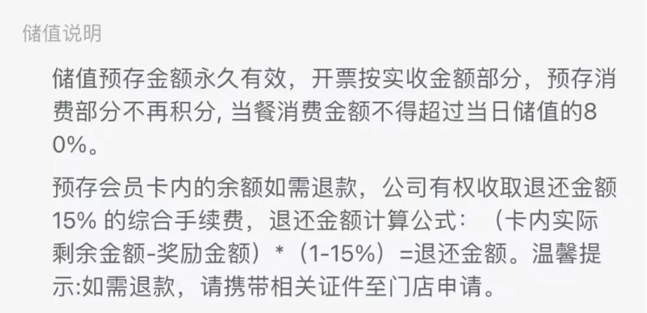 充值会员卡的消费卡余额从几百到几千不等。同时,根据消费者提供的截图信息,如果需要退款预付会员卡余额,公司有权收取15%的综合手续费,并要求在办理退款手续前携带相关证明到店铺申请。