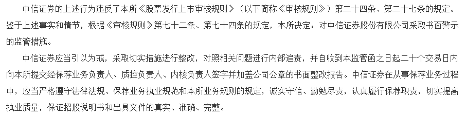 基于上述问题,深圳证券交易所决定对中信证券采取书面警告的监管措施。深圳证券交易所要求,中信证券应当以此为戒,采取切实措施进行整改,对相关问题进行内部追究责任,并在收到监管函之日起20个交易日内提交书面整改报告。