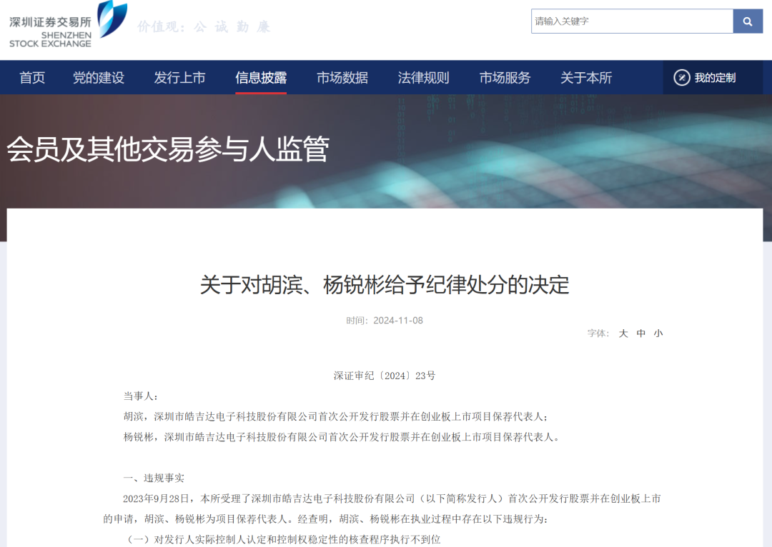 对上述申辩意见,深交所只采纳了“已履行一定核实程序”的建议,并不采纳其他意见。 最后,深交所在2024年11月8日至2025年5月7日期间,对两名保荐代表人六个月不接受其签署的发行上市申请文件和信息披露文件的政纪处分,不接受其签署的发行上市申请文件和信息披露文件。