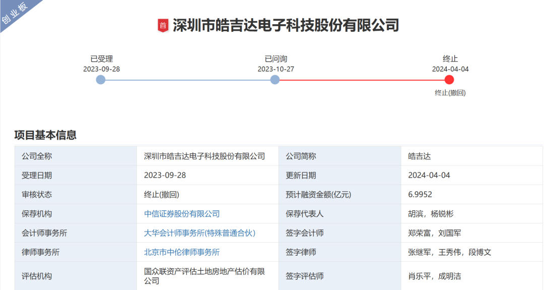2023年10月,深圳证券交易所发出首轮审批询证函。此后,皓吉达的IPO流程停滞不前。今年4月,皓吉达取消IPO申请,深圳证券交易所停止其发行和上市审核。