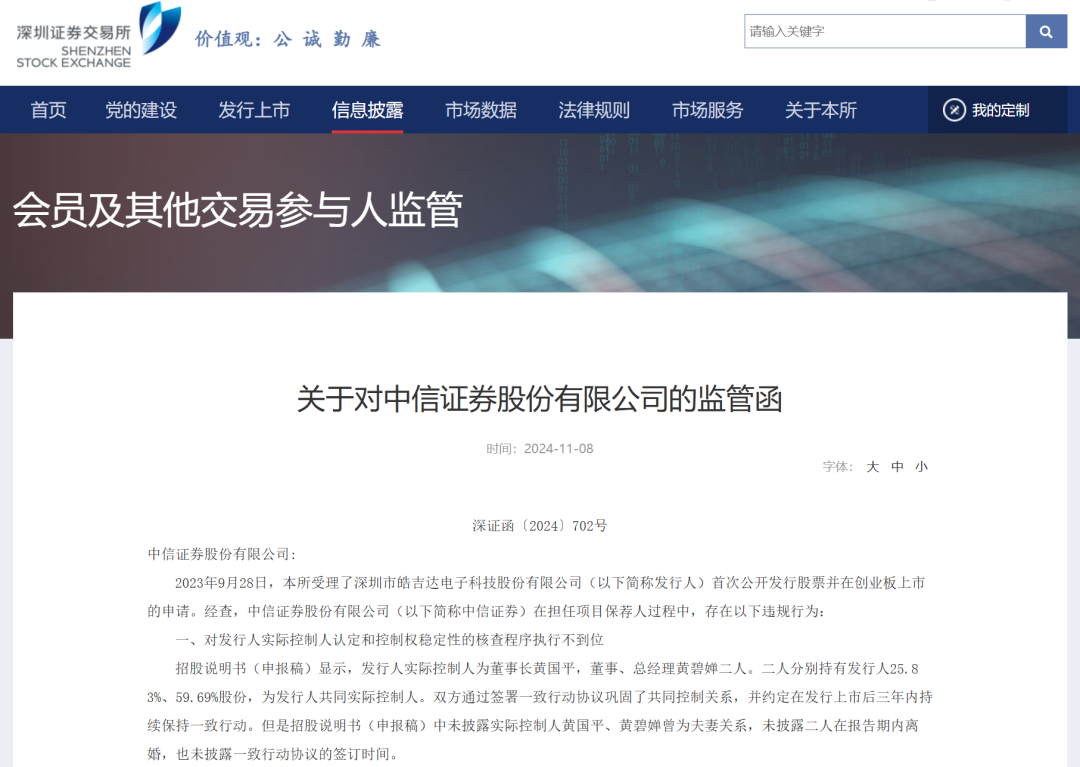 深交所在监管函中指出,中信证券在担任皓吉达项目的保荐人中,存在两种违规行为。