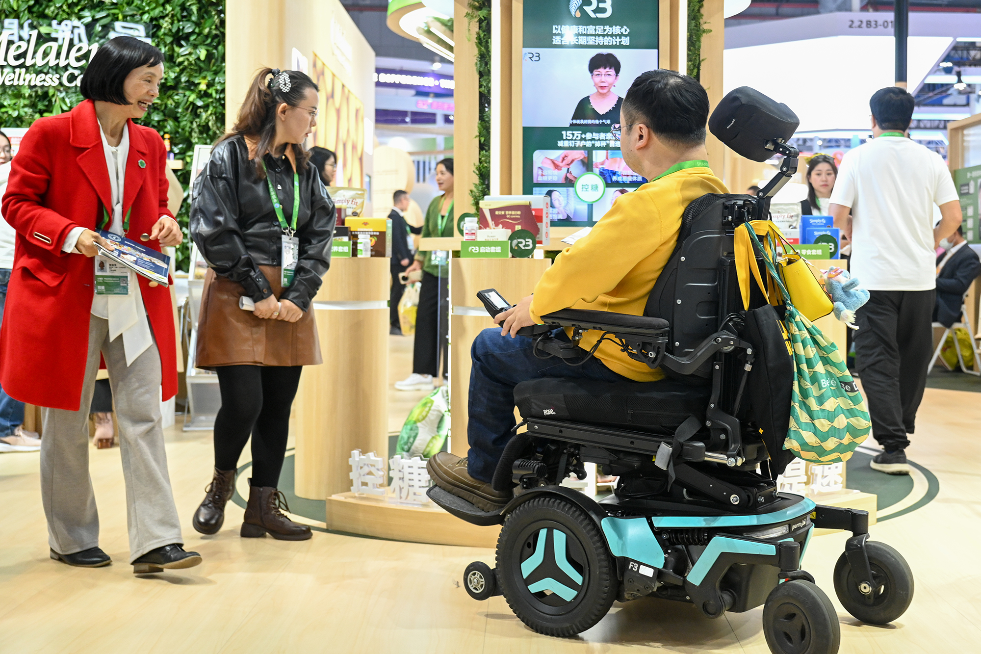 2024年11月8日,一名坐电动轮椅的观众在国家会展中心(上海)参观了展览。本报记者 朱伟辉 图