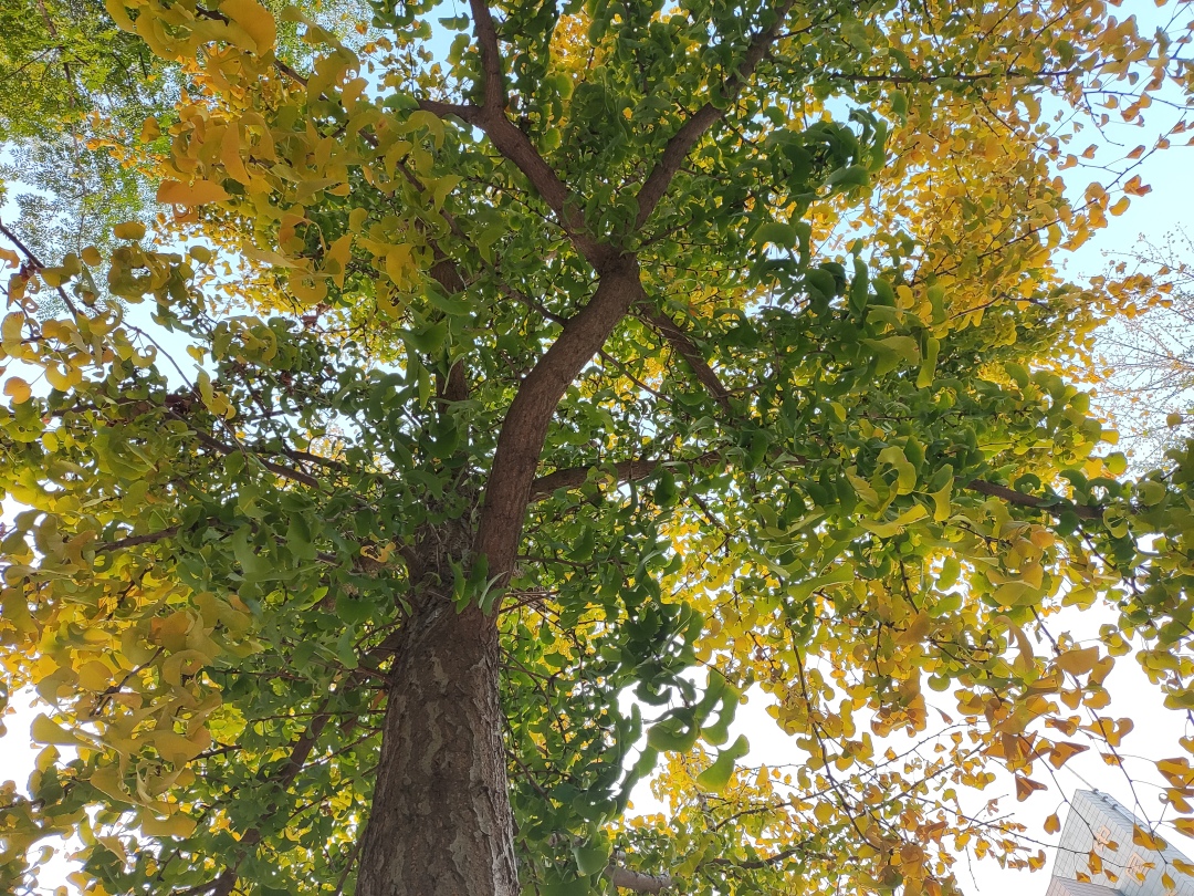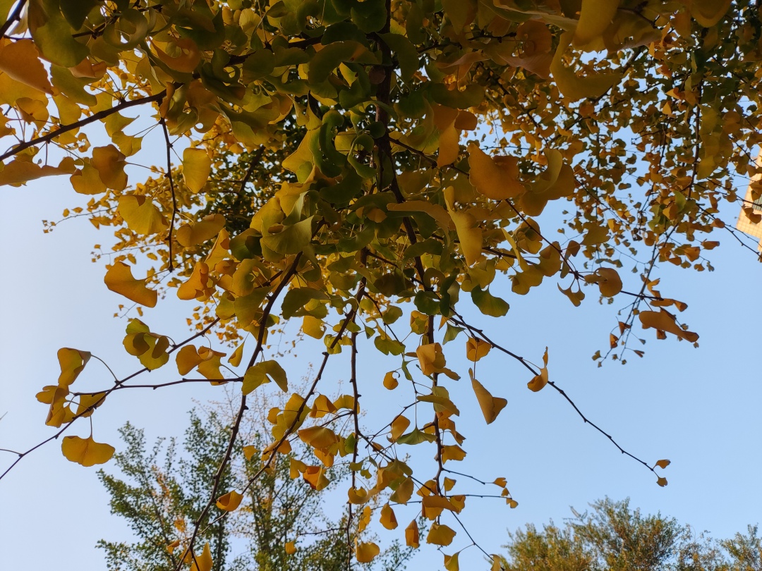 目前,修桥路两旁的银杏树已经开始慢慢褪去绿色的衣服,露出迷人的色彩,比如嫩黄、鹅黄、金黄、数色,还有一些镶有金边的绿色连衣裙,一层一层地晕染着秋天。