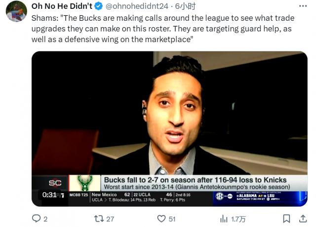 北京时间 11 月 10 日,ESPN 名记 Shams 在节目中说:“雄鹿已通知全联盟寻找交易机会,目标是加强后卫和防守侧翼!"另一记者 Brian Windhorst 还说:“有球队高管透露,雄鹿确实在联盟中寻求交易,但送走字母哥的机会并不完美。”