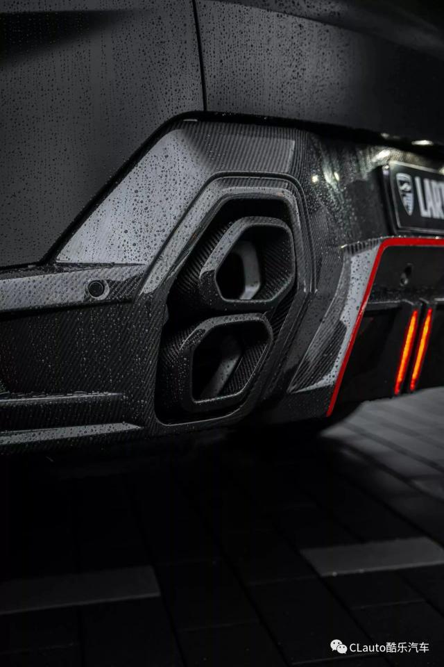 车尾变化更加明显,增强后保险杠延伸部件,配备更高的扩散器和更高的扩散器。 F1 式 LED 尾灯,顶部还有扰流,其六边形双排气管也装饰着碳纤维装饰。
