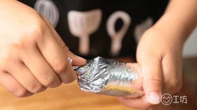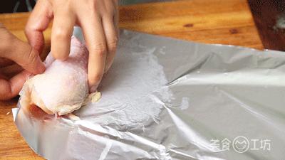 4. 撕开一段锡纸,将腌制好的鸡肉平放在上面,然后慢慢卷起,两头扎得像糖块一样。