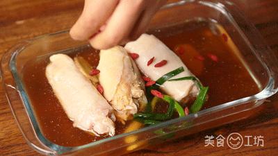 如果天气冷,直接在室温下浸泡一夜,让醉人的酒香倒入鸡肉中。切好之后,看到鸡肉的圆圈很紧,汁液很丰富。吃完一片唇齿留香。