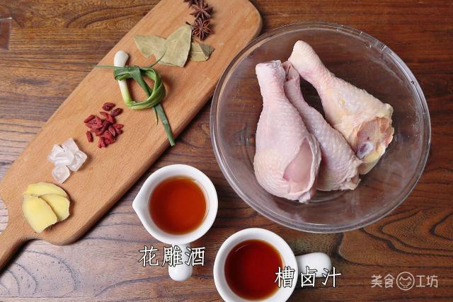 6. 将花雕酒和糟卤汁倒入冷却卤水中,加入枸杞、葱结和姜片,制成醉鸡卤汁。