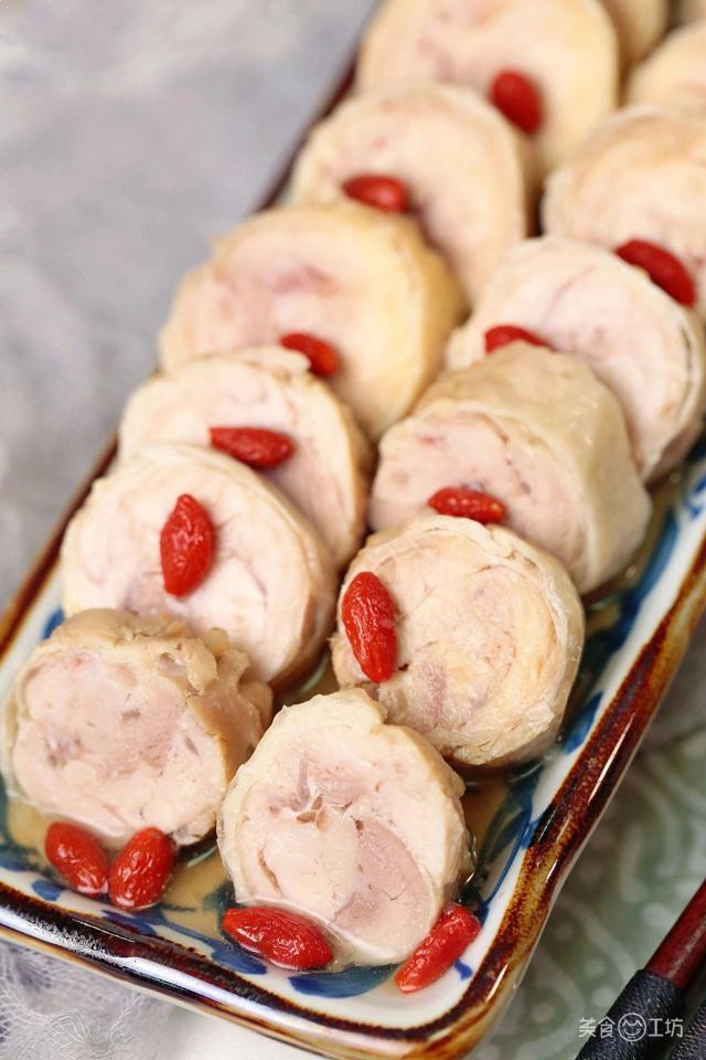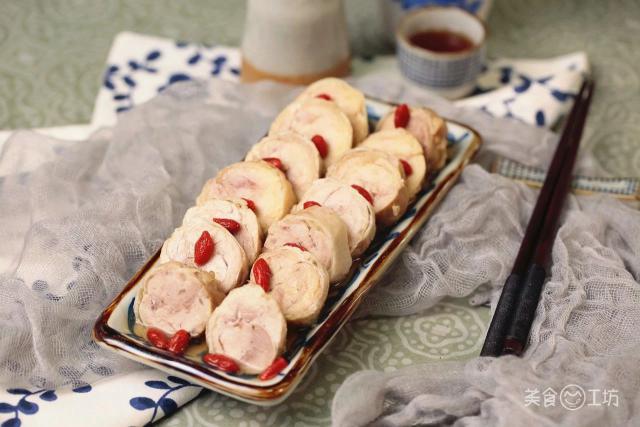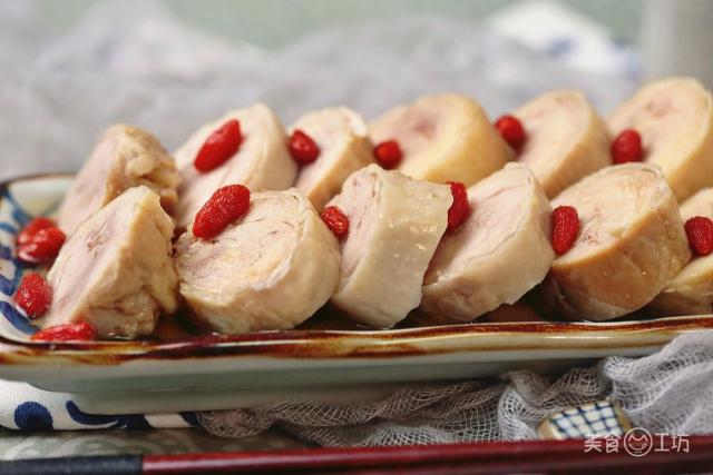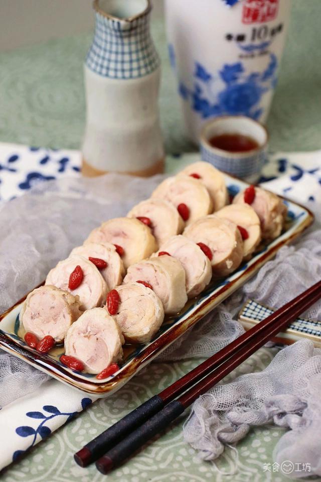 7. 撕下锡纸,将鸡腿卷放入醉鸡卤汁中,撒上枸杞,浸泡 24 可密封放入冰箱,取出切开即食。
