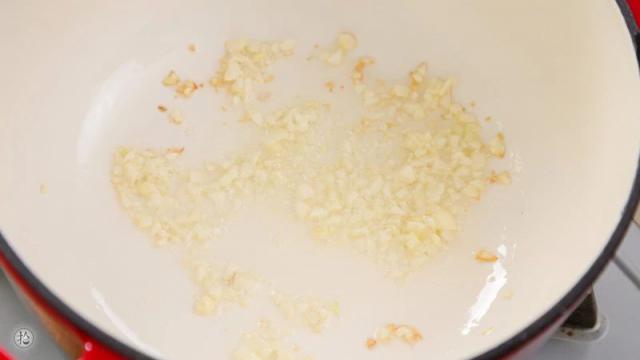 珐琅锅热锅低油,放入蒜末炒出香味。