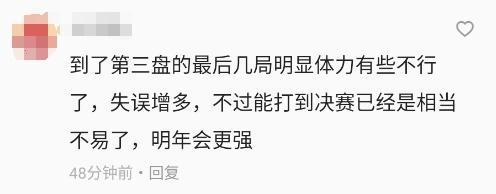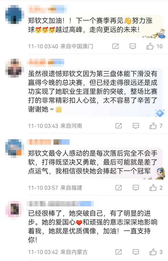 有网友在央视新闻客户端下方留言,称郑钦文“打决赛已经相当不容易了,明年会更强”。