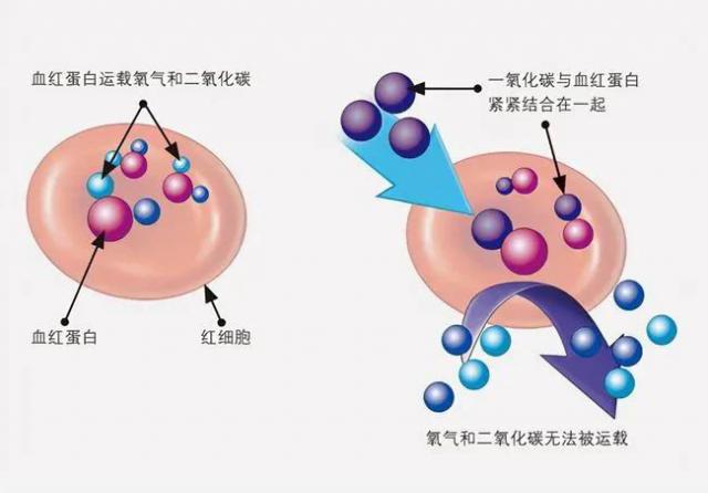 一氧化碳吸入体内,会与氧气争夺血液中的血红蛋白,使氧气无法与血红蛋白结合,造成人体缺氧。