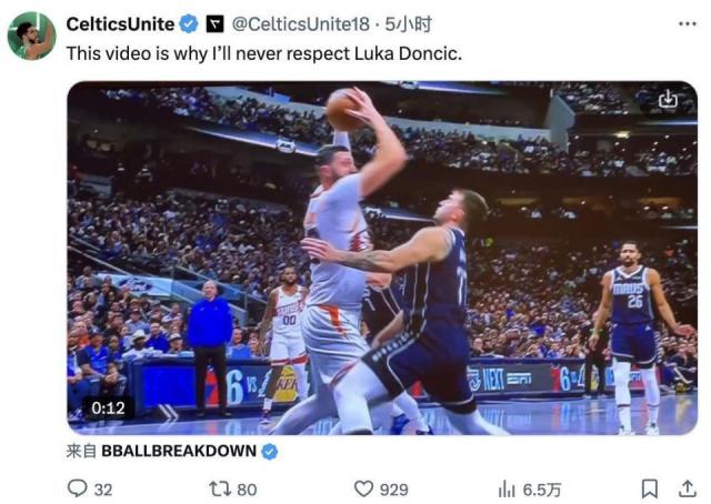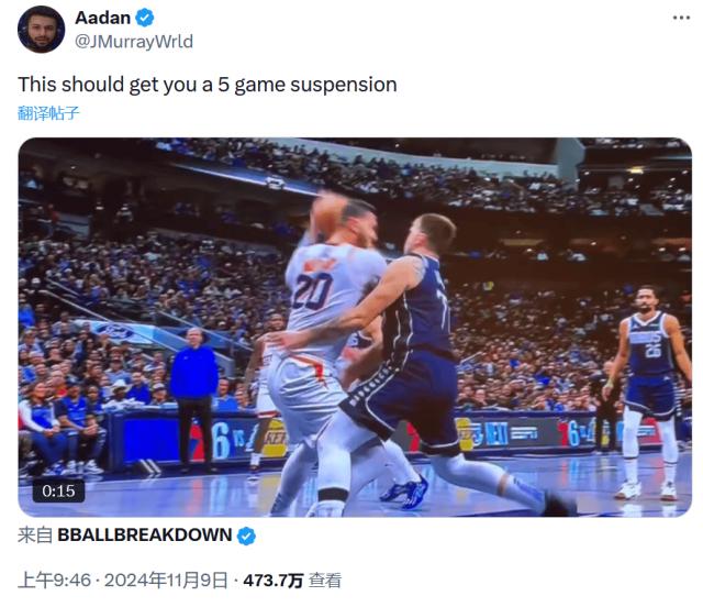 "(讽刺反话)希望东契奇没事,那真是一记重肘。"