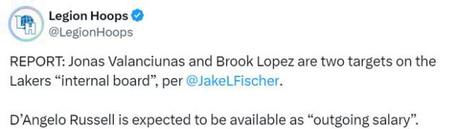 "德安吉洛 - 拉塞尔即将被交易,他以离队工资的形式被交易,” Fischer “我们知道湖人队过去一直在寻求加强中锋位置,下一步也是如此,”在播客节目中说。前面我们提到了布鲁克 - 我听说洛佩斯是湖人队的潜在目标之一。正如我们之前所说,瓦兰丘纳斯是另一个值得关注的名字,我听说他在夏天进入了湖人队内部的中锋选项讨论。"