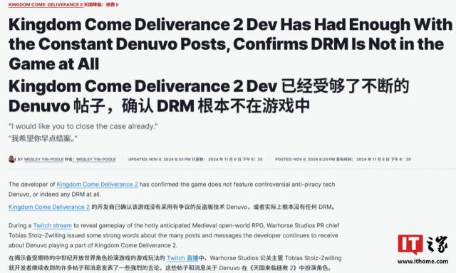 现在,这款游戏的开发团队已经明确回应了游戏《天国:拯救 2》不会使用 D 加密算法,与此同时,游戏也不会有什么 DRM 系统。