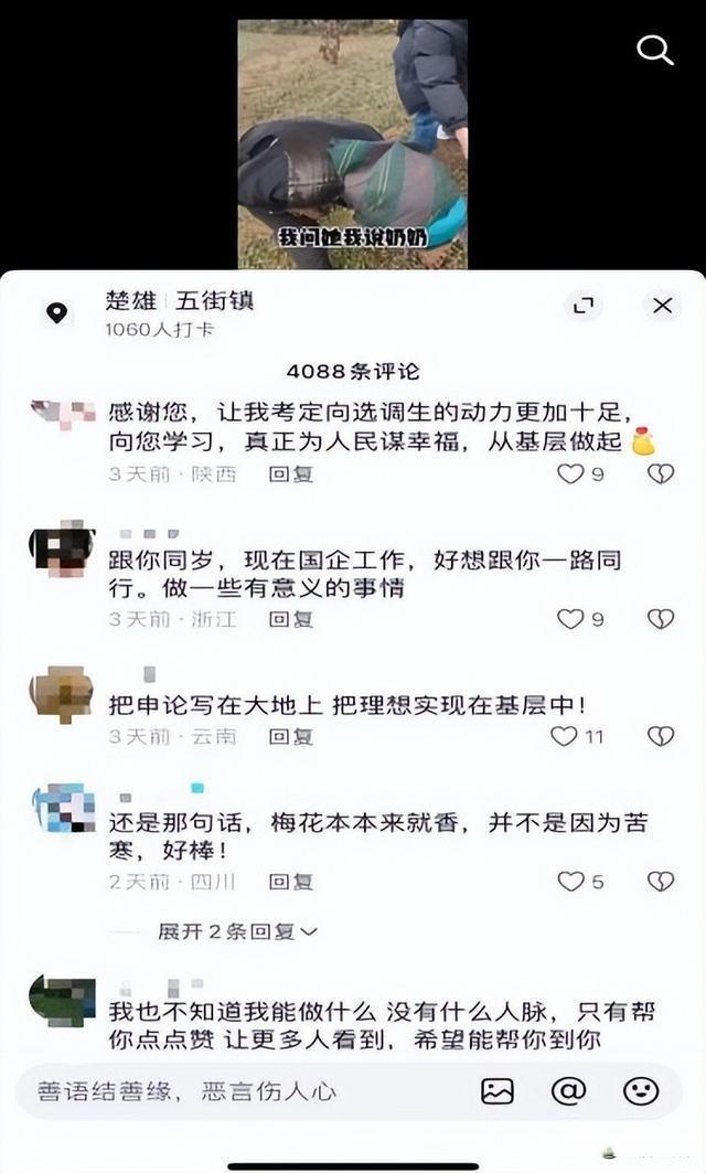 视频上传后,很多网友赞不绝口,留言。“你让我对定向选调生的热情更高。向你学习,真正为人民谋幸福,要从基层做起。”“虽然我不能直接帮忙,但我会表扬,让更多人看到。”